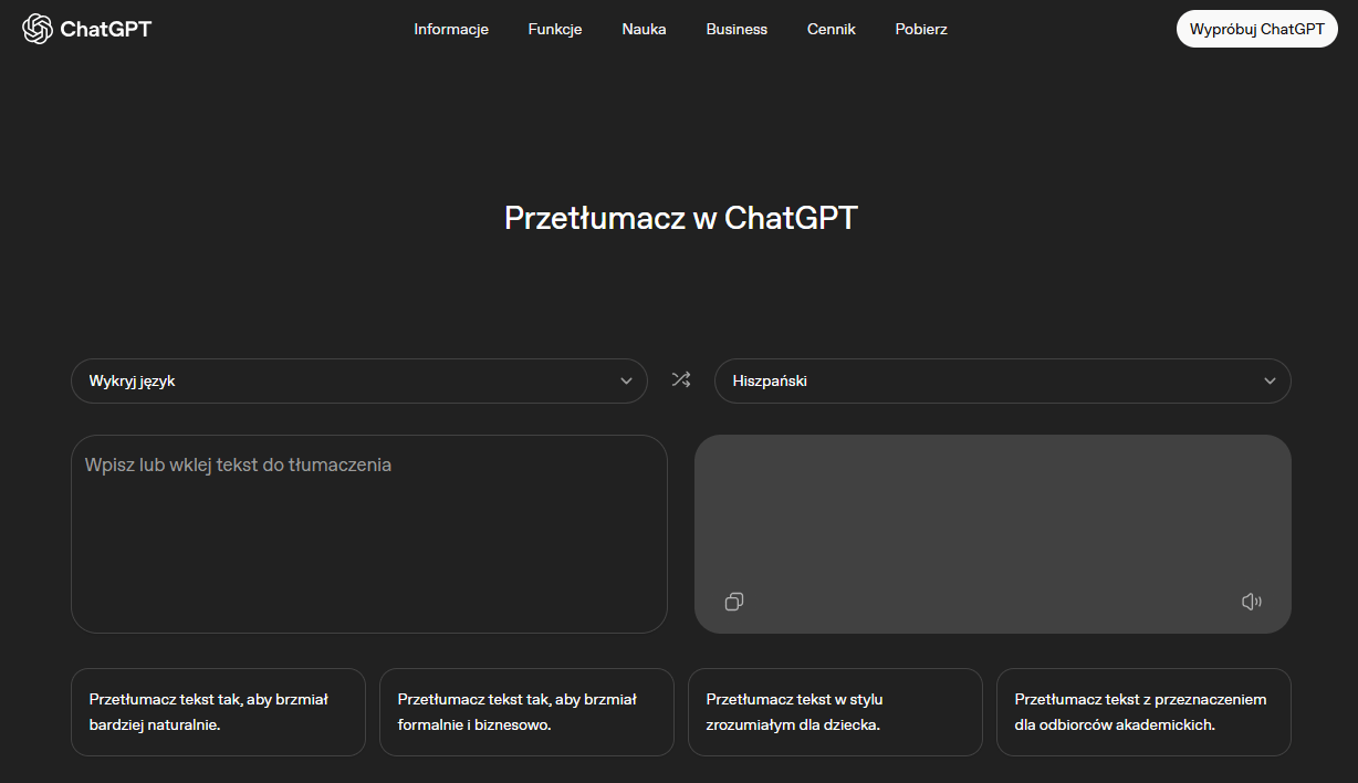 Z usługi można korzystać bez zakładania konta, jednak po zalogowaniu ChatGPT Translate oferuje rozszerzone możliwości. Użytkownicy otrzymują dostęp do skrótów pozwalających szybko zmieniać styl językowy wygenerowanego tłumaczenia.